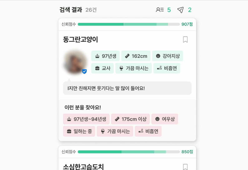 이상형 정확도 순으로 검색 결과를 확인할 수 있어요.